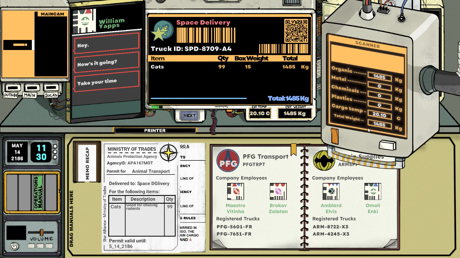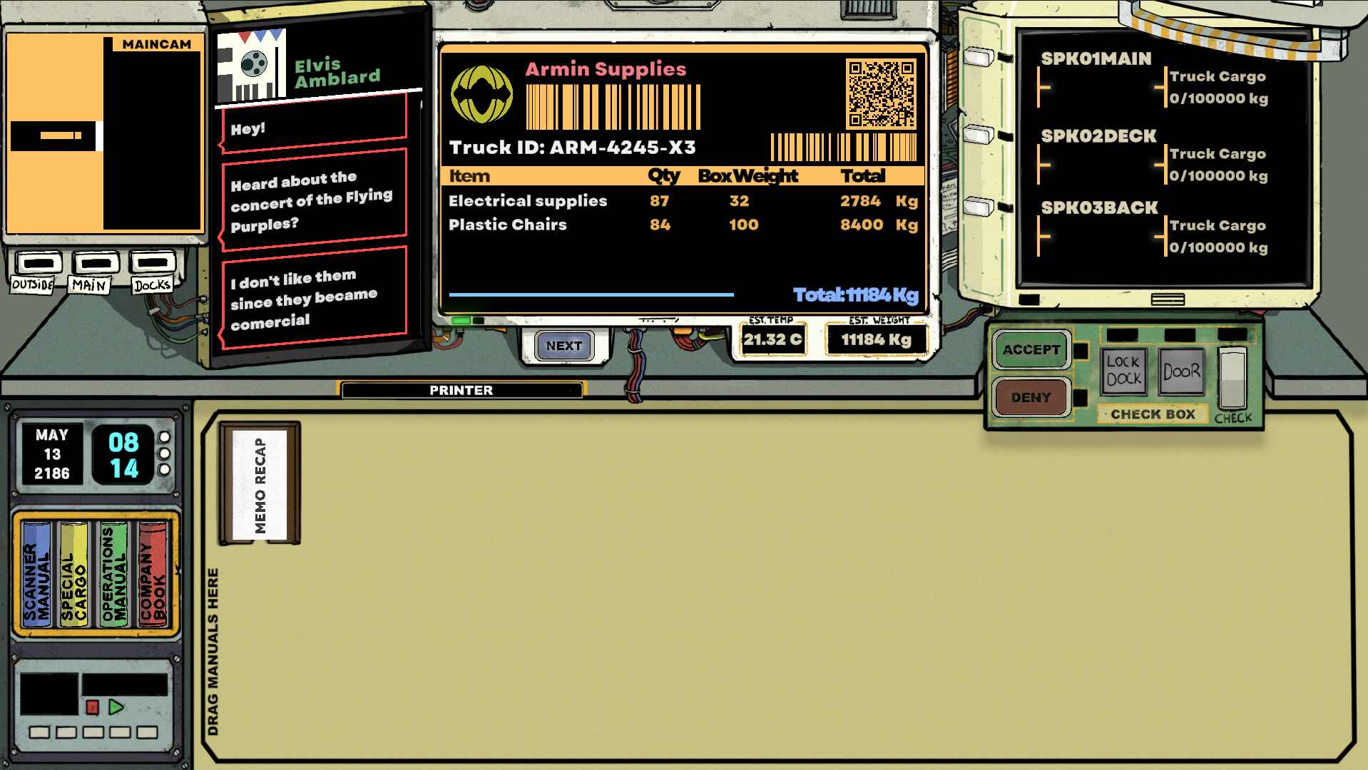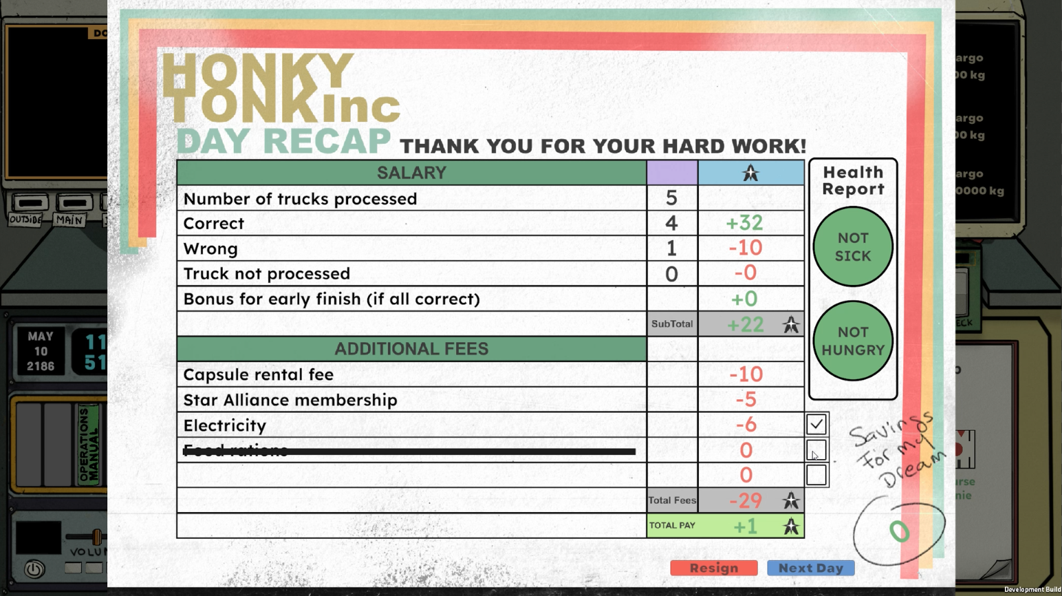 - Sometimes the dock buttons are intractable when they shouldn't (in between trucks or at the end of the day / last truck) and can cause a soft lock on the next day. Still unsure how it happens, I tweaked some code here and there but not sure if it's fully fixed.