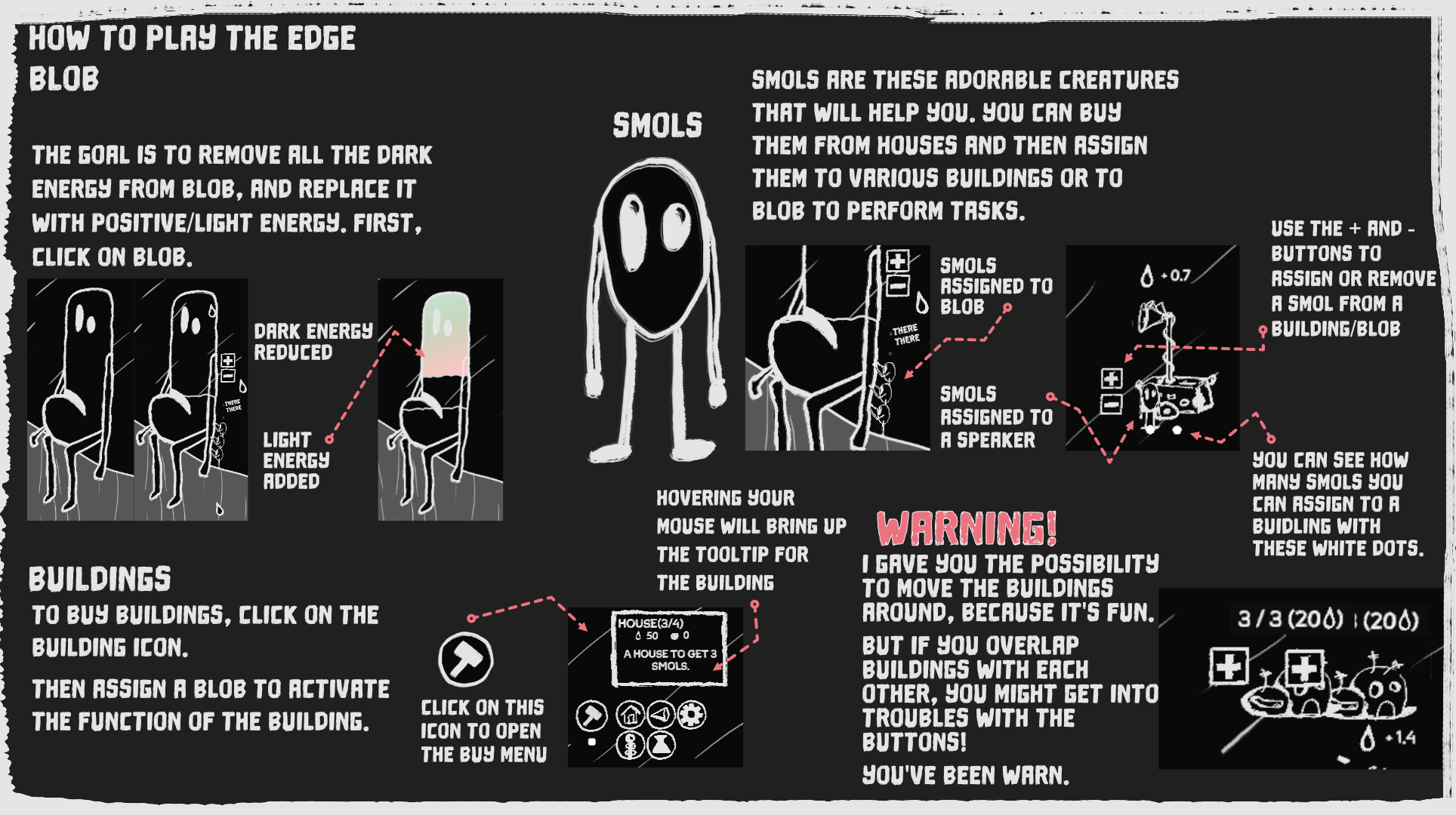 Blob came to sit by the edge. Blob is sad, they are full of dark energy. By comforting Blob, you can help get rid of the dark energy. But that's not enough... If we remove all the dark energy, Blob is just... empty.